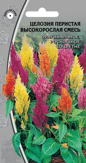 СМЕСЬ ПЕРИСТАЯ ВЫСОКОРОСЛАЯ Оригинальное, роскошное соцветие Декоративная обильно цветущая смесь однолетников разнообразных расцветок, высотой 100 см. Листья имеют пестрые цвета: от светло-зеленого до пурпурного, кончики заострены. Цветки мелкие, яркой окраски, собраны в крупные метельчатые соцветия. Цветет с конца июля до первых ночных заморозков. Предпочитает открытые солнечные места. Используют для клумб, рабаток и сухих букетов.