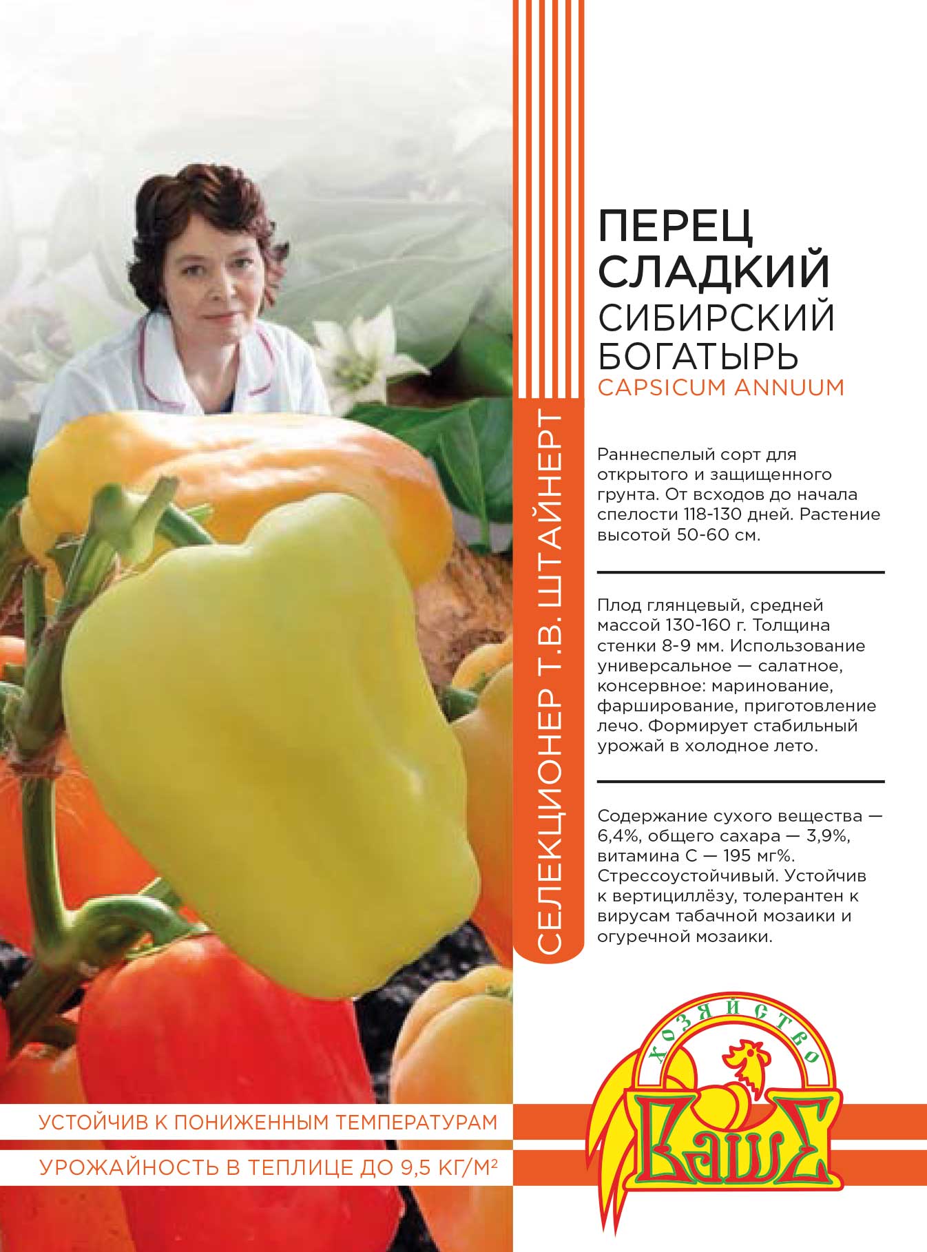 Сорт среднеранний, стабильно урожайный. Период от всходов до технической спелости перцев занимает 118-130 дней. Растения среднерослые, компактные, полуштамбовые, отлично развиваются и формируют плоды и в открытом, и в закрытом грунте, благодаря устойчивости к болезням и неблагоприятным факторам окружающей среды (перепады суточных температур не оказывают влияния на урожайность). Словом, «Богатырская наша сила…»
